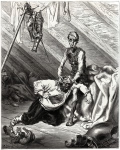 DonchisciottenellalocandaIl “Don Qujiote” è un libro completo: irriverente, divertente, saggio e interessante. Un testo che si inizia a leggere con fatica, spaventati sia dal numero di pagine, dal linguaggio ampolloso, che dalla lentezza di alcune parti, ma è anche un libro che crea dipendenza. Ogni capitolo viene letto portandosi al successivo non per sforzo ma per bisogno, sperando che il libro non finisca. Una storia complessa che può essere letta con leggerezza, per divertimento, dando così ragione a Cervantes che non pensò di scrivere un libro fondamentale per la letteratura mondiale, ma solo un bel libro da leggere che lo aiutasse a vivere.